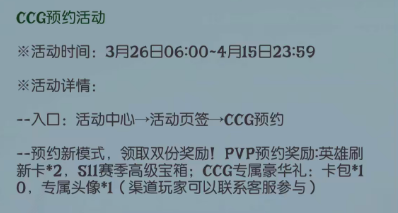 除了玩法的双向革新,本次更新还埋下了一个重磅伏笔——CCG模式预约的开启。游戏内点击预约按钮并完成操作,即可领取PVP模式专属预约奖励;4月16日CCG模式正式上线后,已预约玩家在创建角色时,还能额外领取丰厚的CCG模式专属预约奖励!