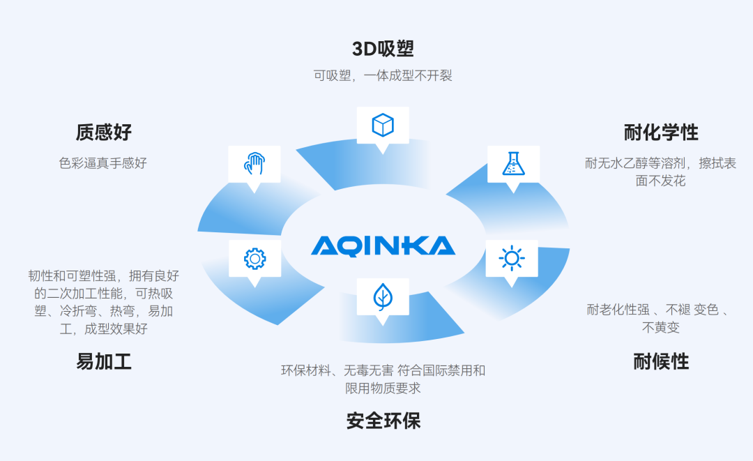 突破传统PET膜平面局限,拉伸率高达500%,完美适配复杂立体造型。相较PVC吸塑产品,实现无毒无醛环保升级,耐黄变、抗溶剂、高抗划伤等性能全面提升,提供高光/哑光多色定制方案,助力客户打造差异化竞争力。