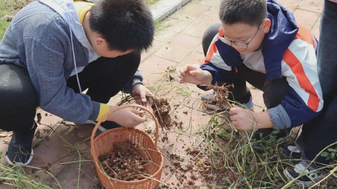 秋意正浓,耕读园里一片丰收景象。同学们历经春播夏耘的辛勤,终于在此刻迎来最甜蜜的犒赏。他们在泥土中小心探寻,每当挖出饱满的红薯或花生时,脸上便绽开惊喜的笑容。同学们轻轻拂去泥土,如数家珍般比对着各自的“战利品”。沉甸甸的果实与灿烂的笑容,交织着劳动的甘甜与分享的喜悦。