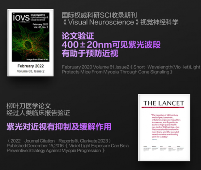 而国际权威科研SCI收录期刊《visual Neuroecience》视觉神经科学,也进一步的论文验证400+20nm可见紫光波段有助于预防近视。
