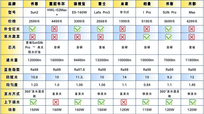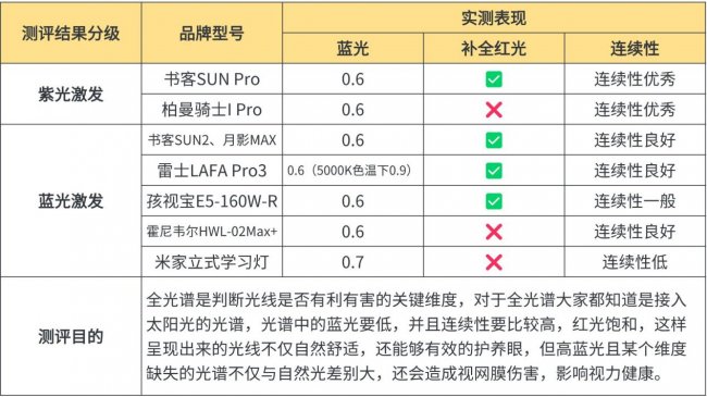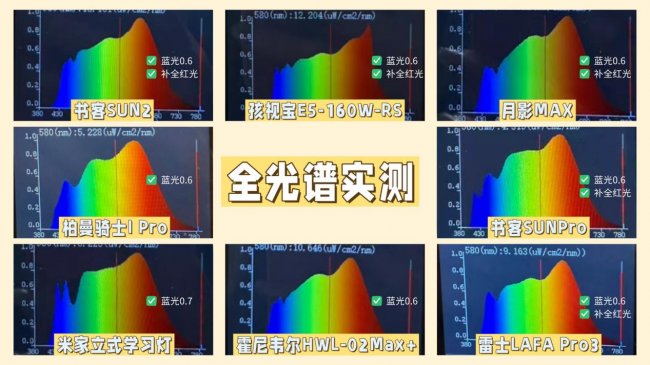 蓝光激发全光谱:书客SUN2、月影MAX、霍尼韦尔HWL-02Max+、孩视宝E5-160W-R、米家立式学习灯、雷士LAFA Pro3