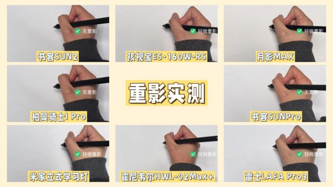 实测方法:将护眼大路灯调到日常使用亮度,用肉眼检查写字手部以及笔部是否存在重影现象。