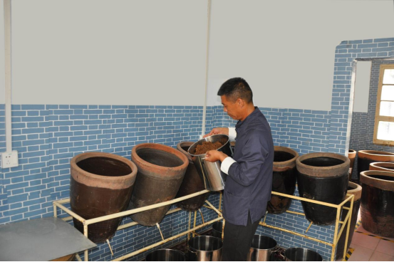 石碾的碾压、陶缸的微醺、醋液的澄亮、窖藏的静谧,这些古法酿醋的场景,深深烙印在周战伟的心里。初中毕业后,他没有远赴他乡,而是选择扎根乡土,一边跟着父亲系统学习酿醋技艺,一边尝试着做小生意、闯市场,乡村服务、小商贸等营生他都一一涉足,在摸爬滚打中积累了丰富的社会经验和资金基础。但无论走多远、做什么,那缕萦绕鼻尖的醋香,始终是他心中最难以割舍的牵挂。他深知,周氏米醋的六百余年传承,从来不是一门简单的养家手艺,而是一份承载着民间智慧、民族文化的责任,从祖辈手中接过这份技艺,就意味着要扛起守护与传承的重担。