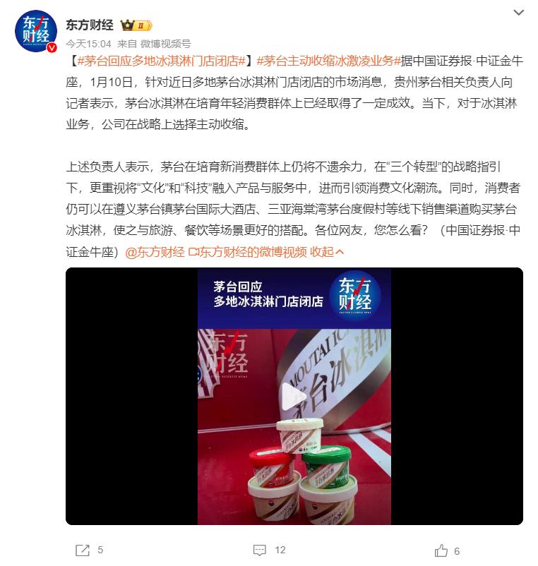 对于上述消息,1月10日,茅台相关负责人回应表示,茅台冰淇淋在培育年轻消费群体上已经取得了一定成效。当下,对于冰淇淋业务,公司在战略上选择主动收缩。消费者仍可以在遵义茅台镇茅台国际大酒店、三亚海棠湾茅台度假村等线下销售渠道购买茅台冰淇淋,使之与旅游、餐饮等场景更好的搭配。