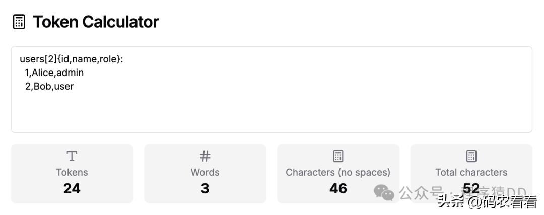 users[2]{id,name,role}: 1,Alice,admin 2,Bob,userTokens 为:24