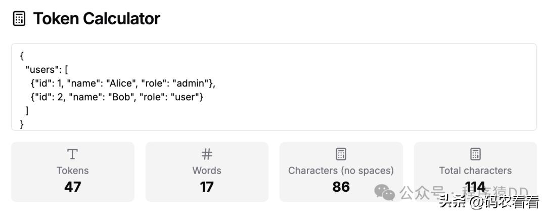{ "users": [ {"id": 1, "name": "Alice", "role": "admin"}, {"id": 2, "name": "Bob", "role": "user"} ] }Tokens 为 47: