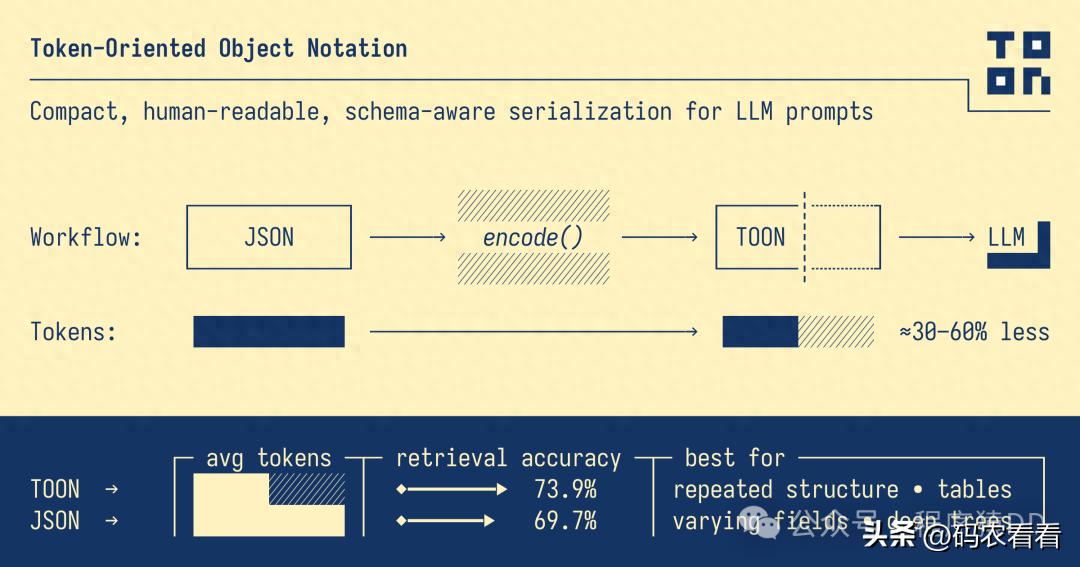 在大模型逐渐融入业务系统的阶段,结构化数据输入/输出已成为落地应用的必需:RAG 检索结果、Agent 工具调用参数、业务查询结果、批处理列表等都需要让自然语言与“可机读”的结构化格式互通。事实标准是 JSON,但在高频调用、海量数据场景下,JSON 的标点开销会显著推高 token 成本。