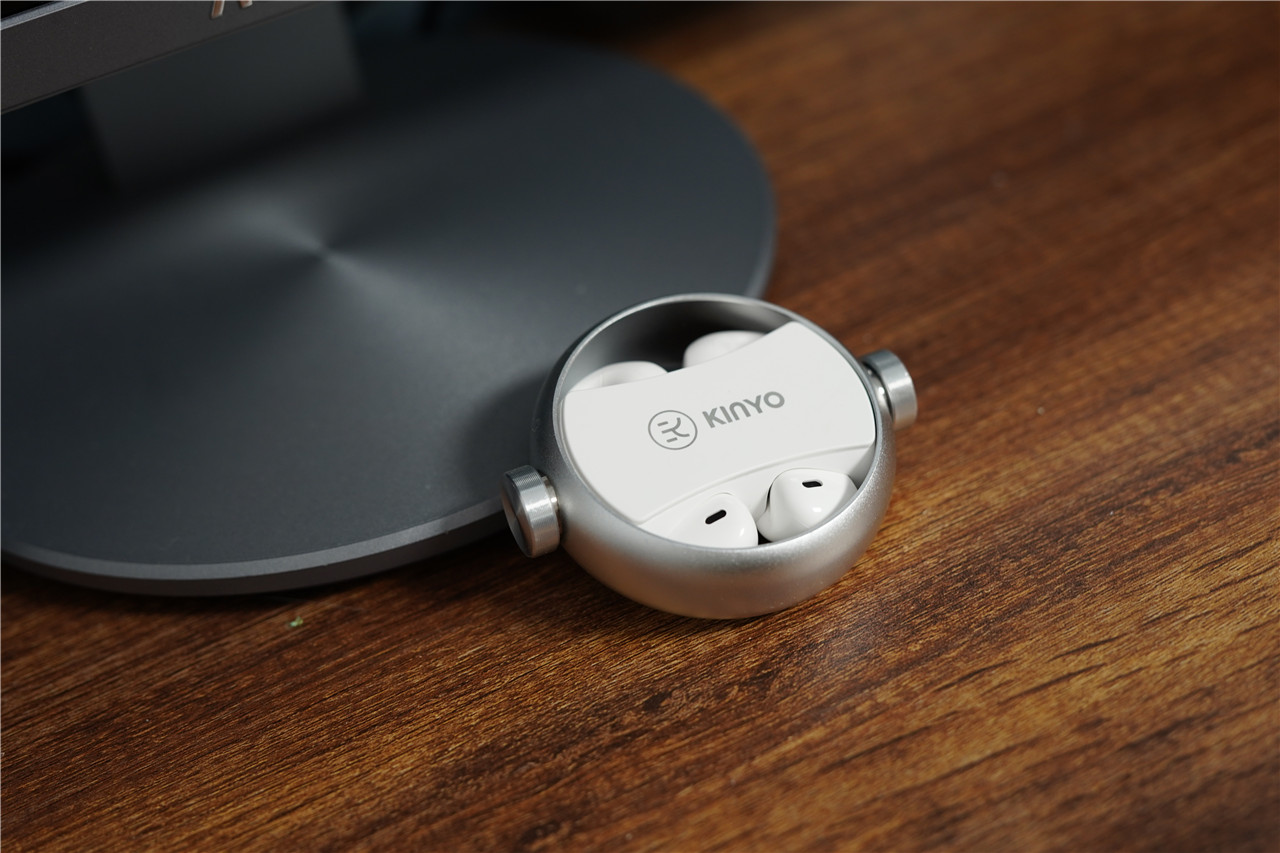 金运A2蓝牙耳机充电舱上部收纳着耳机式佩戴的蓝牙耳机、下部则收纳着半入耳佩戴的蓝牙耳机,在一个充电舱内同时收纳两款不同佩戴形式的蓝牙耳机,这在市面上确实并不多见,所以这款产品辨识度蛮高的。