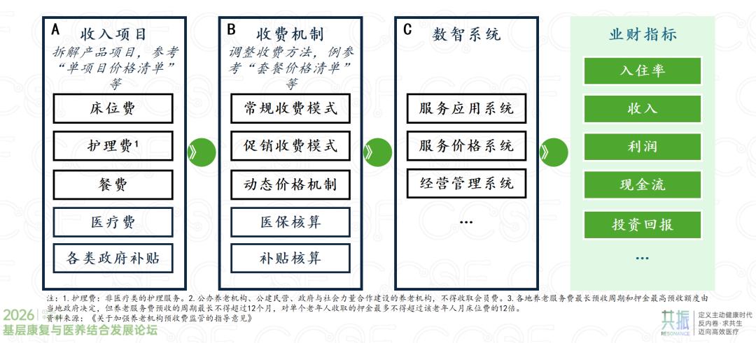 此外,还可以向产业链上下游延伸,自主开发院内制剂、药食同源产品,或引入优质养老用品,形成 “服务 + 产品” 的多元收入结构。针对高收入客群注重品质、医疗刚需客群注重专业的差异需求,设计分层服务体系,进一步提升盈利能力。