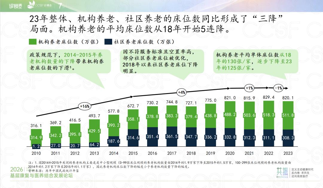 但光鲜数据背后,是行业普遍的生存困境。2023 年,机构养老、社区养老床位数同步下降,机构养老平均单体床位数从 2018 年的 130 张缩减至 125 张。