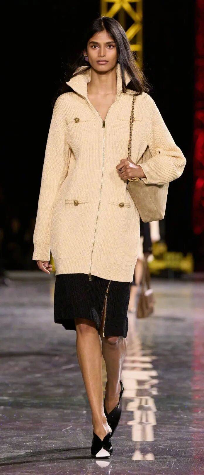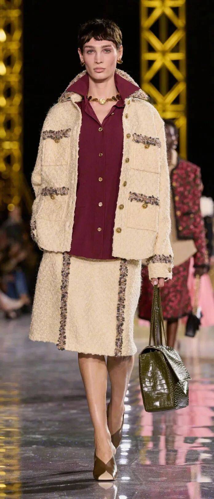 经典四口袋外套不再那么严谨,改用罗纹针织与金银线混纺,蕾丝点缀、珠片排布与手工串珠的羽毛雪纺,延续了高级手工坊的精湛技艺,既有品牌辨识度,又足够日常实穿。