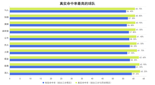尽管如此,湖人结合三分出手情况后的运动战,也就是有效命中率依然达到了59.2%位于联盟第二高,同时结合三分与罚球情况后的真实命中率达到了联盟第一的63.2%,可以说结合并不优异的三分投射后湖人的得分效率依然是联盟数一数二的球队,在其他方面较为一般的情况下他们依靠着高效的得分效率打出了上佳的成绩。