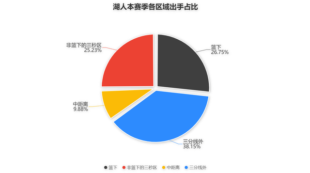 之所以能保持这样的得分效率是因为湖人做到了两点改变,其一是进攻方式的变化,在湖人进攻端的各个区域,他们虽然三分线外的出手次数占比最高,但非篮下的三秒区以及中距离也占有一定的比重,这意味着他们在各个区域都有着一定数量的出手投篮,这样就令对手难以找到防守的重点区域难以针对防守。