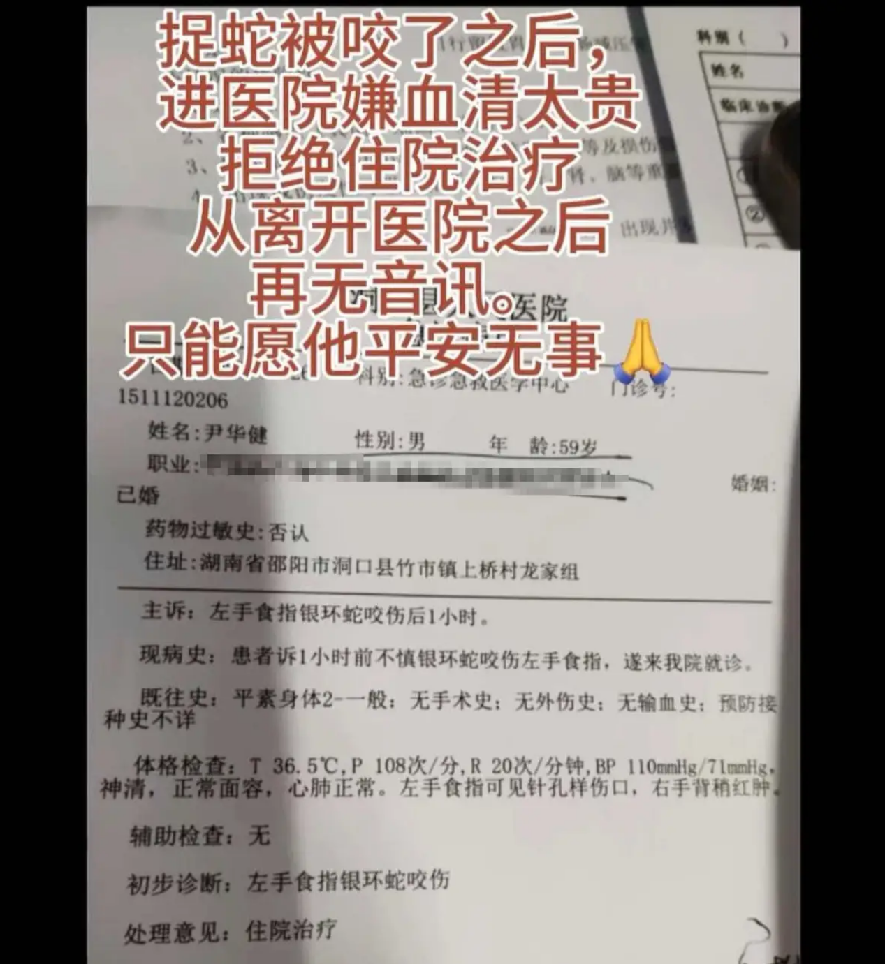 "我知道打血清最好,但实在拿不出这笔钱。"59岁的尹华健在电话那头声音疲惫。两天前,他在直播徒手捕捉银环蛇时被咬伤,随后从医院消失,引发全城搜救。如今突然现身,道出了选择草药治疗的真相。