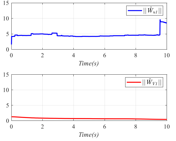 图8给出了评论家网络与执行网络权值的更新过程,说明网络参数在学习过程中保持有界,这为闭环稳定性提供了进一步支撑。