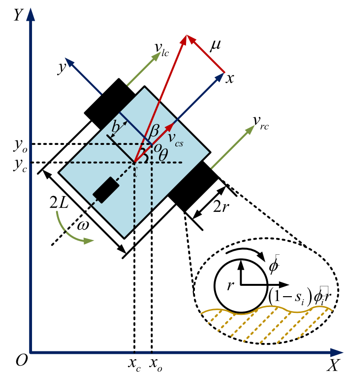 如图1所示,论文从一开始就没有假设机器人处在理想纯滚动状态,而是把打滑、侧滑和滑移损失都显式纳入了运动学描述。