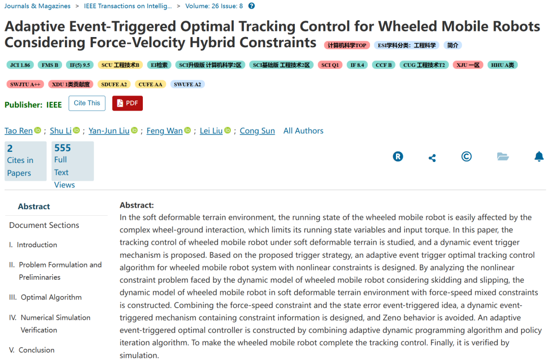 引文格式: Ren T, Li S, Liu Y J, Wan F, Liu L, Sun C. Adaptive event-triggered optimal tracking control for wheeled mobile robots considering force-velocity hybrid constraints[J]. IEEE Transactions on Intelligent Transportation Systems, 2025: 26(8): 11945-11956.