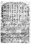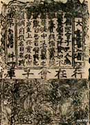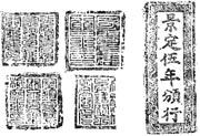天圣元年(1023年)开始发行的官交子,作为防伪措施,上面盖有两颗官印:一为“益州交子务”;一为“益州观察使”。下图是迄今发现的最早的一块纸币印版的拓片。这块纸币印版,版材为铜质,版面为竖长形,长16厘米,宽9.1厘米。上半部刻着“除四川外许于诸路州县公私从便主管并同见钱七百七十陌流转行使”二十九个字。下半部刻有房屋、人物和成袋的包装物以及三个人正在房屋外面空地上背运货物等图形。票面上虽未刻有货币名称,但依据票面图案古朴、出自四川和无货币名称等情况,可以基本认定其为早期的交子印版。