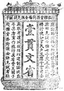 公据公据印制于南宋高宗绍兴二十九年(1159年),使用时间很短。史载宋绍兴二十九年以公据、关子付三路总领所,淮西、湖广关子各八十万缗,淮东公据四十万缗,皆自十千至百千凡五等。内关子作三年行使,公据二年。许瀛鉴主编《中国印刷史论丛》史篇第九十四页。1997年版。
