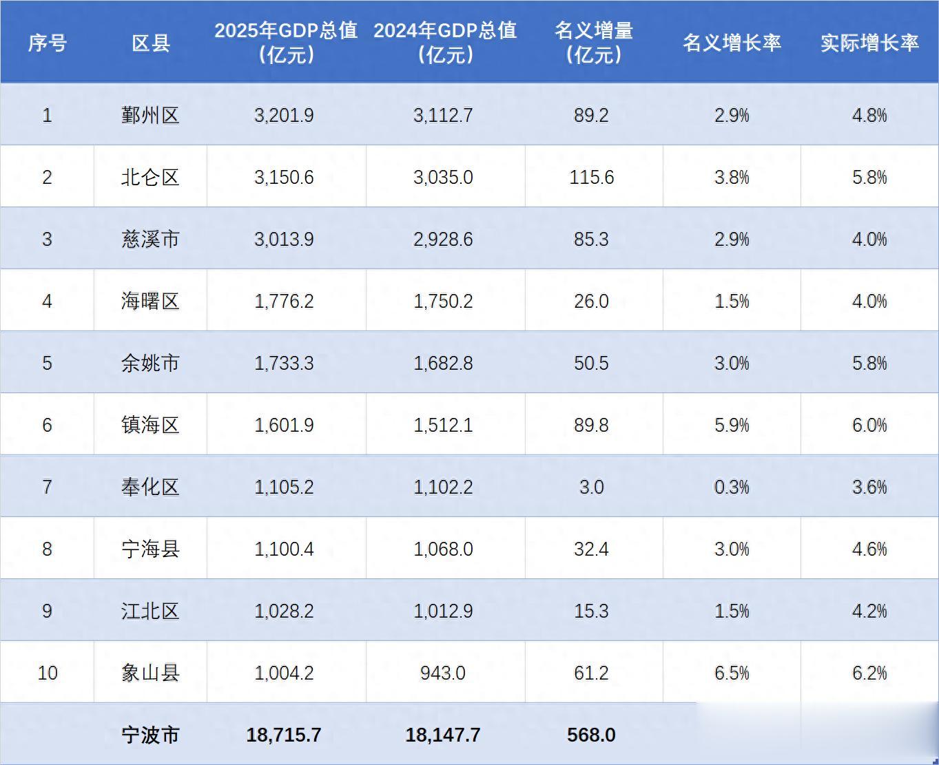 宁波市是我国五大计划单列市之一,经济发展水平高,经济总量常年位居全国前列,具备一争十强城市之力。2025年1-12月份,宁波全市GDP总值共计18715.7亿元,较上年同期增加568亿元,名义增长率为3.1%,按照不变价格计算,实际增速为4.9%。