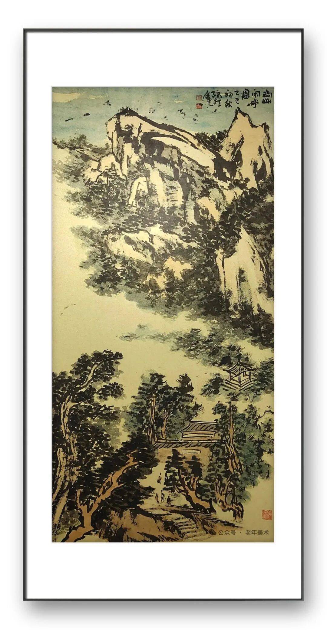 画中远山多以淡墨晕染,层层渐淡,直至与天际相融,营造出“远岫出云”的空濛意境;近山则浓淡兼施,焦墨点苔提神,浓墨画骨立形,淡墨渲染显韵,让山石的立体感与厚重感跃然纸上。尤为精妙的是其“破墨”技法的运用,或以浓墨破淡墨,让墨色交融处生出斑驳的肌理;或以淡墨破浓墨,使厚重处透出灵动之气,墨色的干湿、浓淡、虚实相互交织,形成丰富的视觉层次。