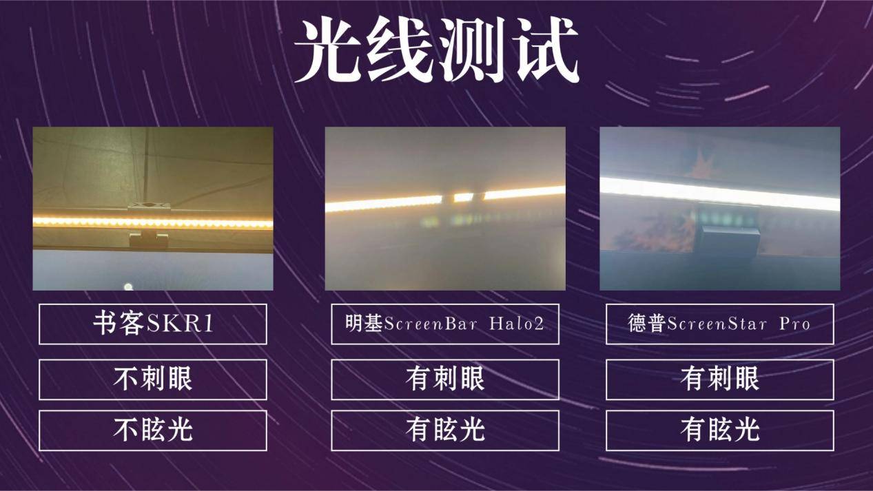 明基屏幕灯值得买吗?在光线直观的实测中,书客SKR1表现最为出色,光源面采用108颗SunLite类太阳光灯珠,光线接近自然光,均匀覆盖整个桌面,不直射眼睛,几乎无刺眼感,长时间使用也能保持眼睛舒适。相比之下,德普ScreenStar Pro整体光线较亮,虽然均匀,但直视时仍有轻微刺眼感,也有轻微的眩光感,长时间使用容易产生眼疲劳。但是明基ScreenBar Halo2的光线刺眼感最明显,眩光明显,使眼睛频繁调节瞳孔,长时间使用舒适度不及前两者。