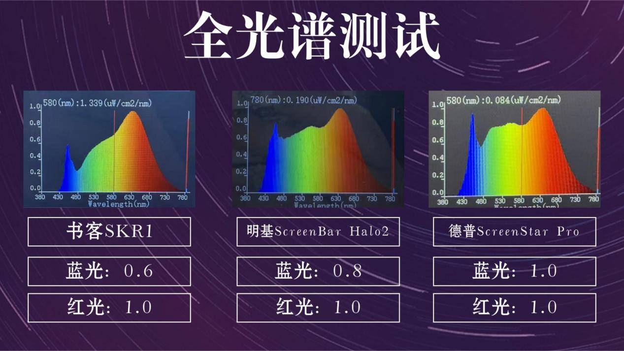 明基屏幕灯值得买吗?在全光谱表现方面,书客SKR1依然领先,测试出来的蓝光含量仅为0.6,是三款屏幕挂灯中最低的,得益于蓝光过滤和定向偏转光学设计,它能有效削减有害短波蓝光,减轻约64%的眼睛刺激,长时间使用眼睛更轻松。而明基ScreenBar Halo2的蓝光含量为0.8,经过一定处理,相对安全,但经过官网查询,使用的是RG1低蓝光灯珠,蓝光水平仍略高,这方面会没有那么好。德普ScreenStar Pro蓝光含量最高,测试出来是1.0。但这三款屏幕挂灯的红光测试出来都比较优秀,都是达到了1.0的高含量,虽然三款产品红光补充都为1.0,但高蓝光环境下,长时间使用仍容易让眼睛感到疲劳。