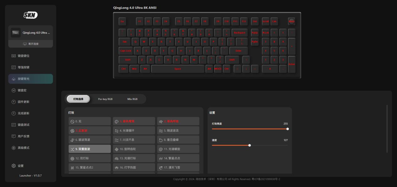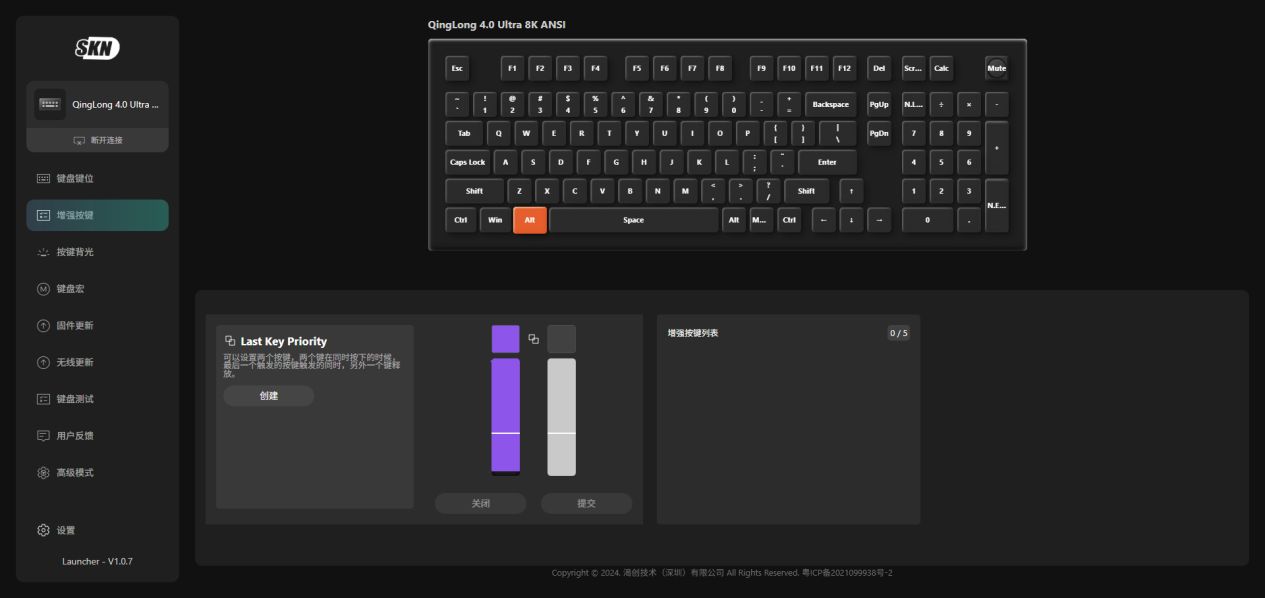 SKN家使用的网页驱动基于VIA协议的配置界面,支持全键位功能重映射、宏命令编程、灯光效果编辑。特别开发的LKP(Last Key Press)算法,加上有线和无线模式下的双8K的高速传输率,在《APEX》等游戏中实现转向与急停的零冲突操作。