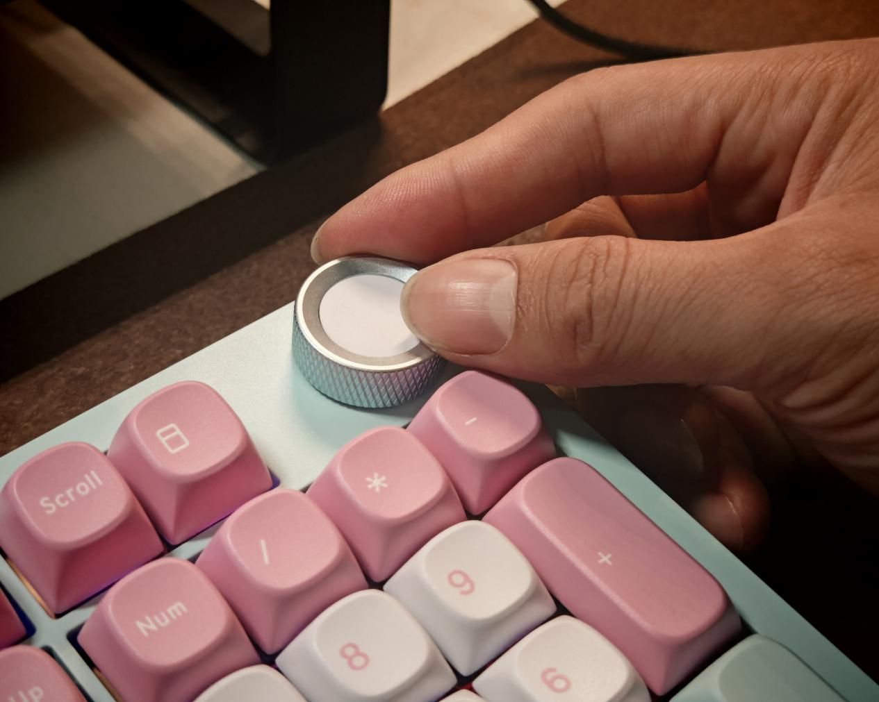 SKN最令我着迷的,除了国潮设计外,就是金属旋钮,金属旋钮表面采用防滑纹路处理,支持音量调节、多媒体控制等自定义功能。