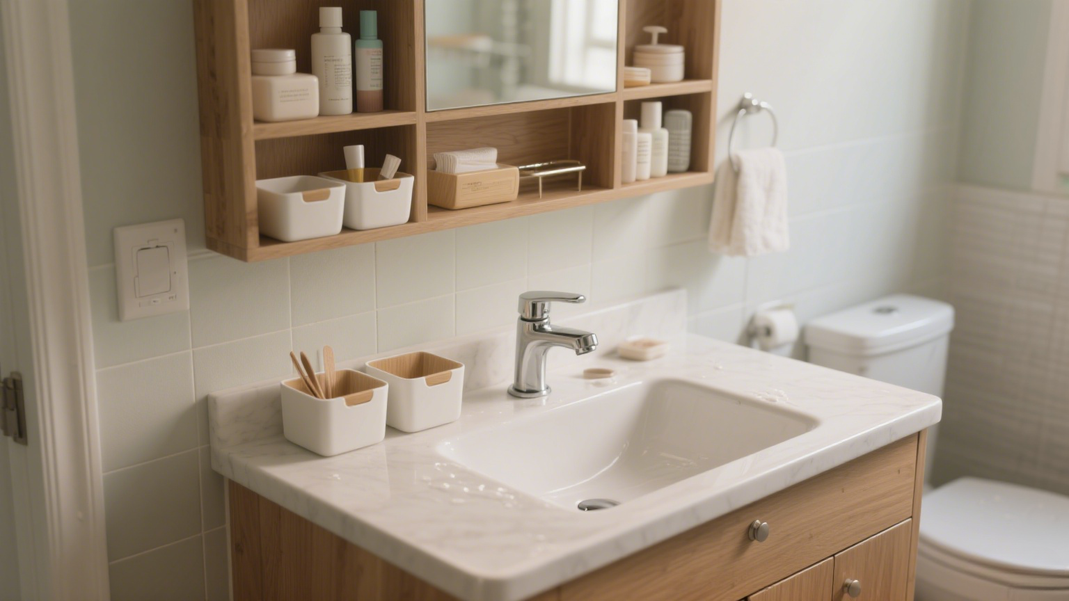 在洗手台上方安装壁挂收纳架,放置常用洗漱用品;台面放带分隔的收纳盒,收纳牙膏、牙刷等小物件;每周清洁一次洗手台,每天将使用后的物品归位,保持洗手台长期整洁,提升卫生间整体清爽度。