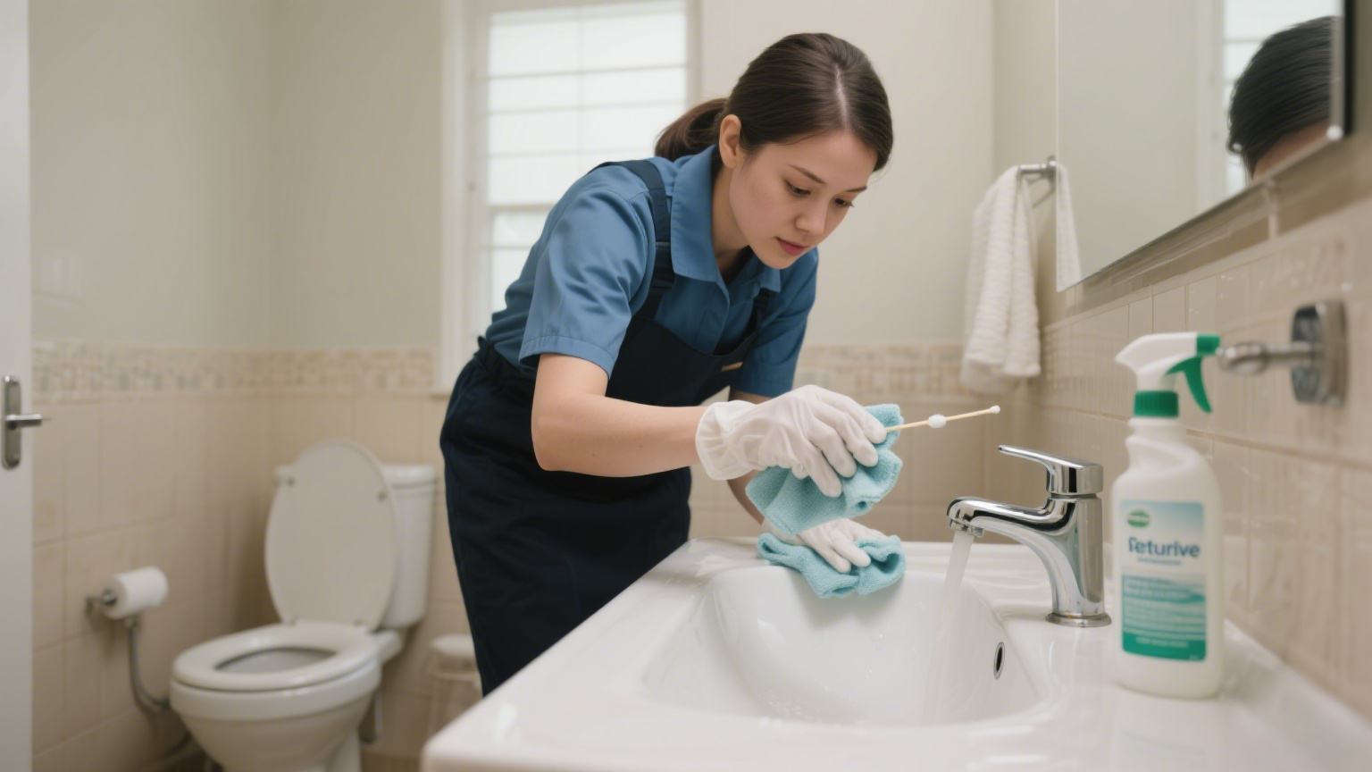 第一步:彻底清洁洗手台表面先用干布擦拭洗手台及台面物品表面浮尘,再用蘸了中性清洁剂的湿抹布(挤干水分)擦拭台面水垢、牙膏渍,水龙头缝隙用棉签蘸清洁剂清理;清洁后用清水冲净台面,用干布擦干水分,避免水渍残留。