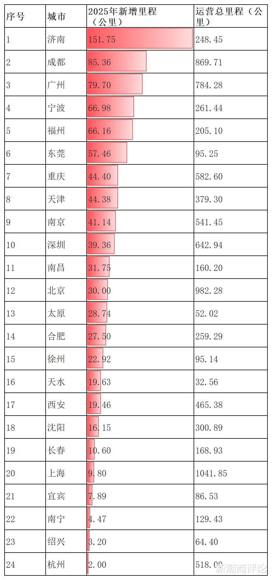 全年新增151.75公里,总里程达到248.45公里,标志着济南正式步入“大地铁时代”。全国排名从2024年的第32位上升至2025年的第19位,跃升了13个位次,超越了长沙、昆明、长春、贵阳、佛山、无锡、福州、南昌、南宁、温州、哈尔滨、金华、厦门等城市。