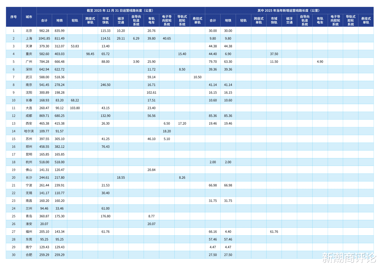 运营里程前十名的城市中,新增里程最多的是成都。2025年新开通4条线路——9月17日10号线三期(武侯祠站-太平园站)、17号线二期开通,12月16日13号线一期、30号线一期正式开通初期运营,轨道交通运营总里程达到869.71公里,全年新增85.36公里。