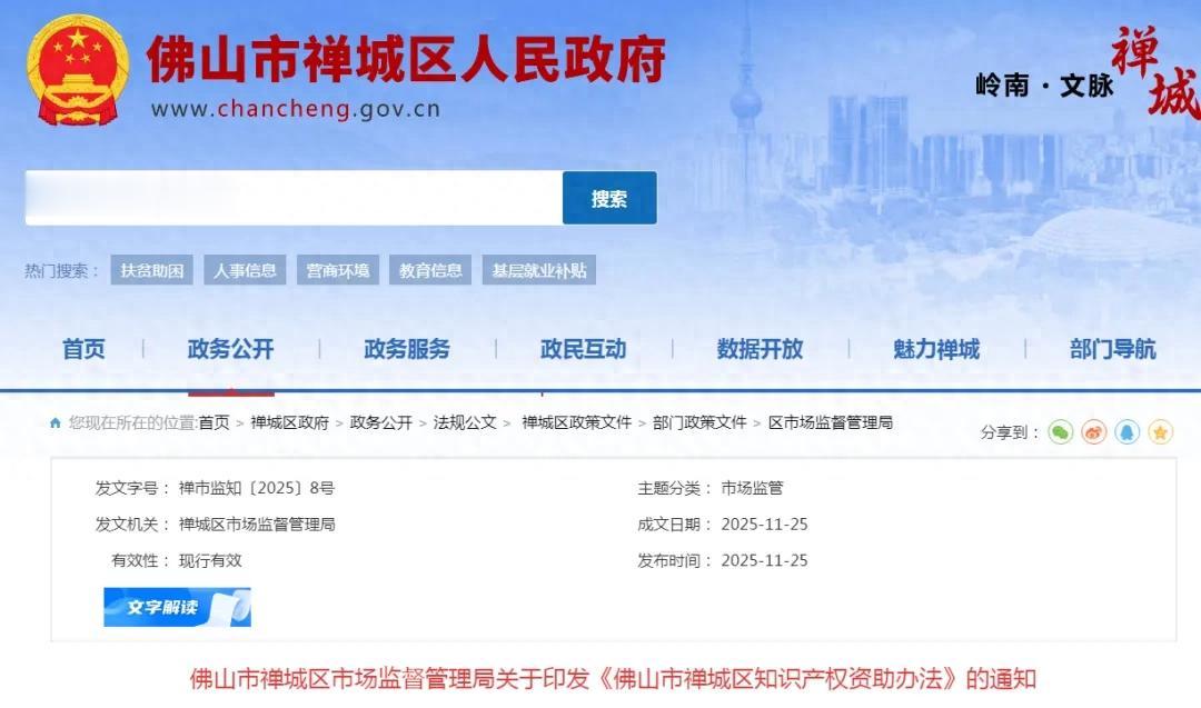 日前,佛山市禅城区市场监督管理局关于印发《佛山市禅城区知识产权资助办法》的通知,其中提到: