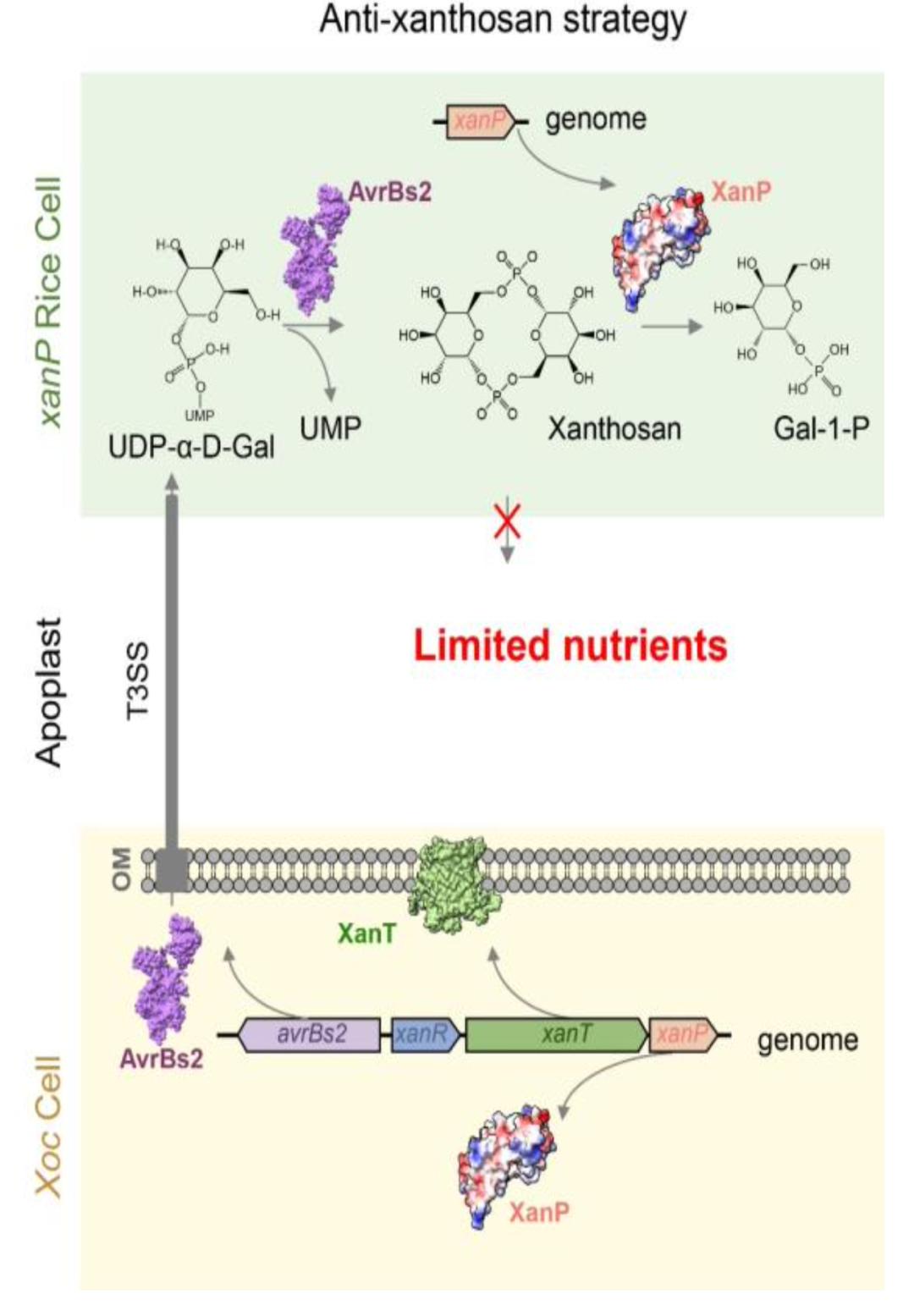 至此,一条“合成-摄取-利用”的完整通路浮出水面:AvrBs2(在植物细胞内合成食物)→ 黄原聚糖(被释放到细胞间隙)→ XanT(将食物运进细菌)→ XanP(在细菌内消化食物),为病菌在宿主植物体内建立了一个专属性的外部营养供应线,成为其成功定殖和致病的关键。