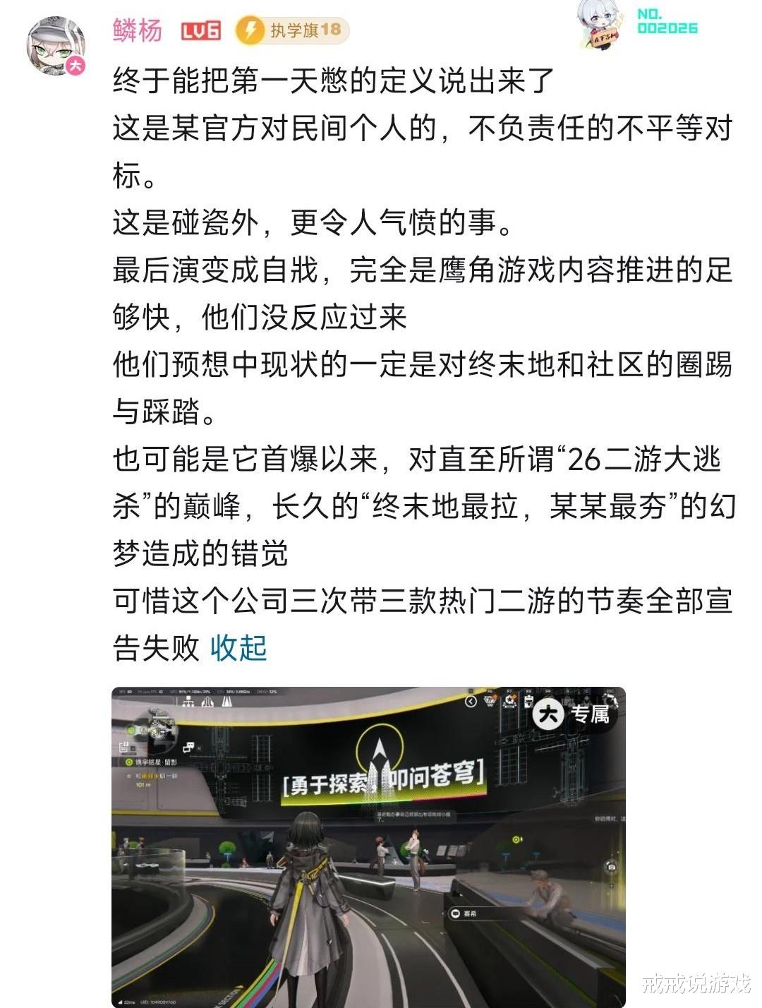 这下终末地玩家直接选择不忍了,在官号最新动态下方发出大量评论,《异环》官方账号评论区也惨遭爆破.其实平心而论这两个看似十恶不赦的导火索,真就一定是《异环》故意找茬吗?戒戒看未必,首先作为一个刚开服还没站稳的新游戏《异环》最怕什么?最怕玩家群体之间互相拉踩带节奏。官方之所以提前把“管理员”这种听起来比较上纲上线的身份类词汇直接加入了屏蔽库,大概率就是紧急避险。如果真是铁了心要恶心粥游,人家早就开麦嘲讽了,何必干这种偷偷摸摸还容易被人抓把柄的事情呢?