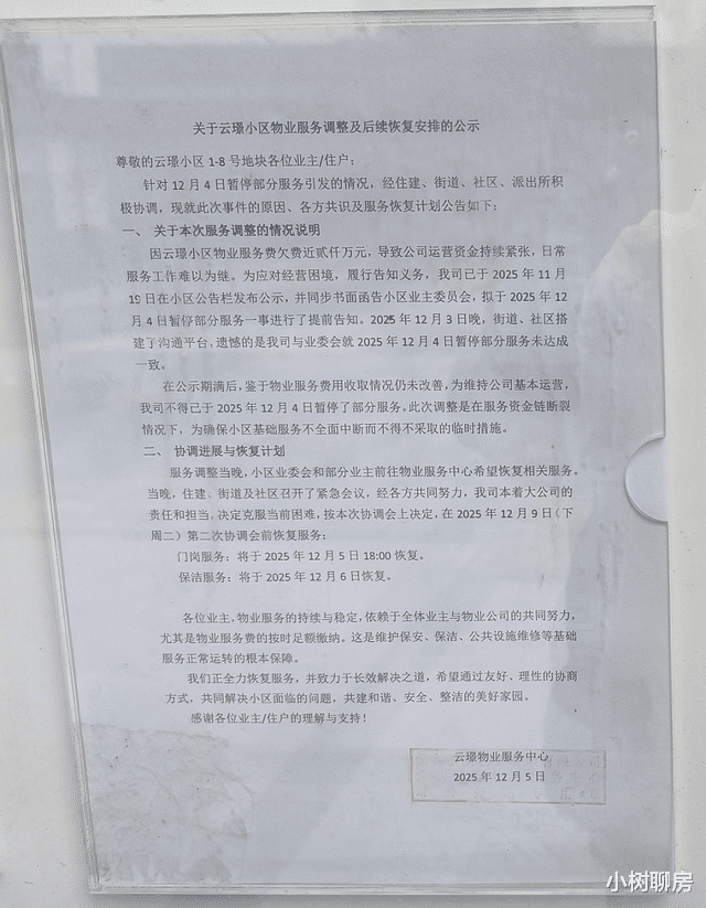 “自2025年12月4日起,我司将暂停部分非基础类物业服务项目,仅保留公共区域部分秩序维护、消防管理等最基本服务内容”