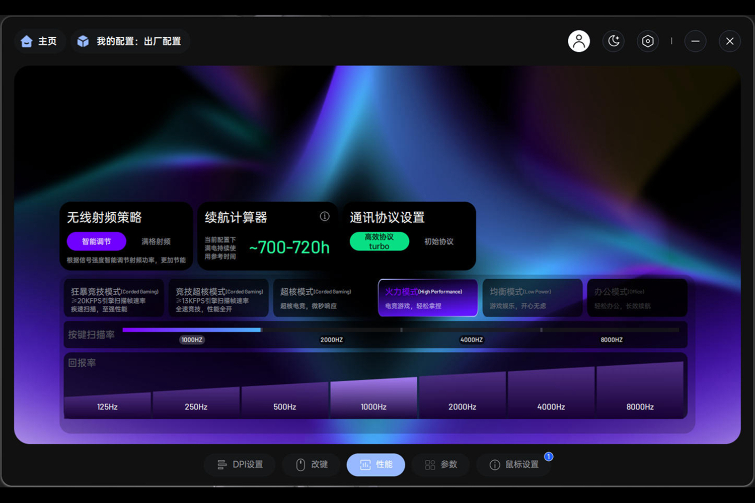 鼠标设置更丰富:DPI可精准调节到45000,支持按键自定义、宏录制,还有6种性能模式可选——狂暴竞技模式(≥20000FPS扫描帧速率)适合FPS游戏,办公模式则优先续航。最实用的是配置文件跟随应用切换功能,我给游戏设置了8K回报率+宏快捷键,给办公设置了低功耗模式,切换应用时自动生效,不用手动调整,效率直接拉满。