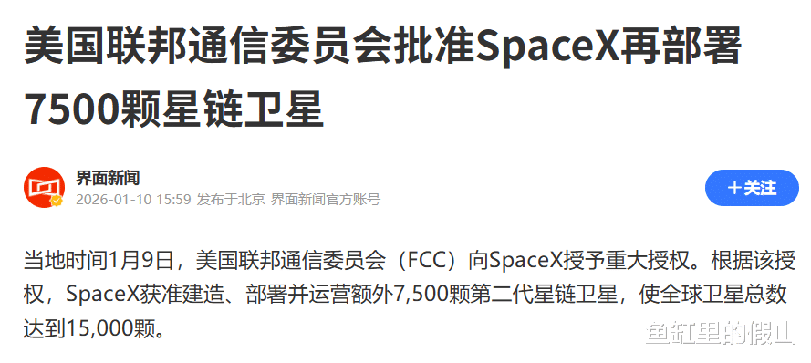 当地时间1月9日,美国联邦通信委员会(FCC)批准SpaceX再部署7500颗第二代星链卫星,这意味着星链在轨卫星总数将冲向1.5万颗这一前所未有的规模。放在人类航天史上看,这是一个极其夸张的数字,毕竟从第一颗人造卫星升空到今天,近70年里,全球在轨卫星的数量加起来,也不过几千颗。如今,一家公司就要占据绝大多数低轨道空间,这本身就值得认真讨论。