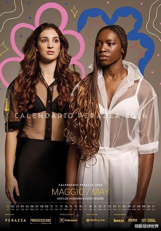 意大利新星玛蒂尔德·穆纳里尼与尼日利亚裔意大利球员梅里特·阿迪格韦的双人合照,两人均着透视感衬衫,一黑一白形成视觉对比,展现新生代球员的个性与融合。