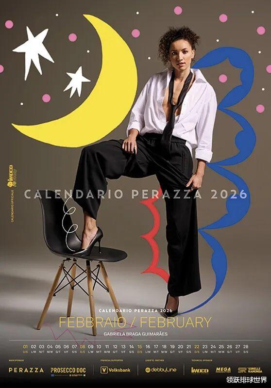 巴西女排核心、队长加比,她身着宽松白衬衫搭配黑色西裤,系着松散领带,单脚踩椅,姿态洒脱不羁,背景是一轮醒目的黄色新月与星星图案,加上粉红点点星光,营造出神秘梦幻氛围,体现她场上场下都闪耀的风采。