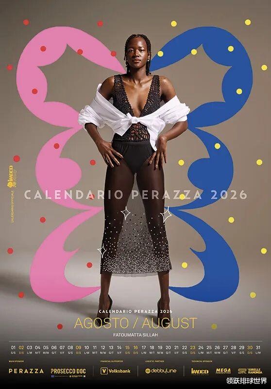 本赛季的新主攻外援西拉,她穿着黑色深V连体装,下摆为透明纱裙,尽显身材曲线,站姿坚定,背景以对称蝴蝶式图案与粉蓝黄点缀,释放野性与力量。