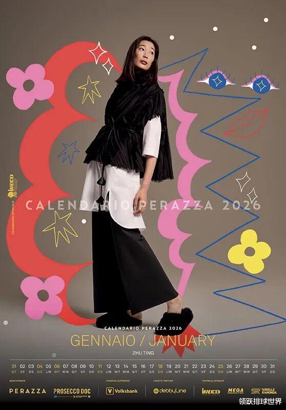 而备受瞩目的中国女排球员朱婷,她身穿黑色褶裥外套搭配白色长衬衫,线条流畅、气质沉稳,完美演绎优雅与力量的平衡,她身边环绕着红蓝色彩交织的插画元素,星星、花朵、睫毛与抽象曲线,衬托出其世界级运动员的自信魅力。