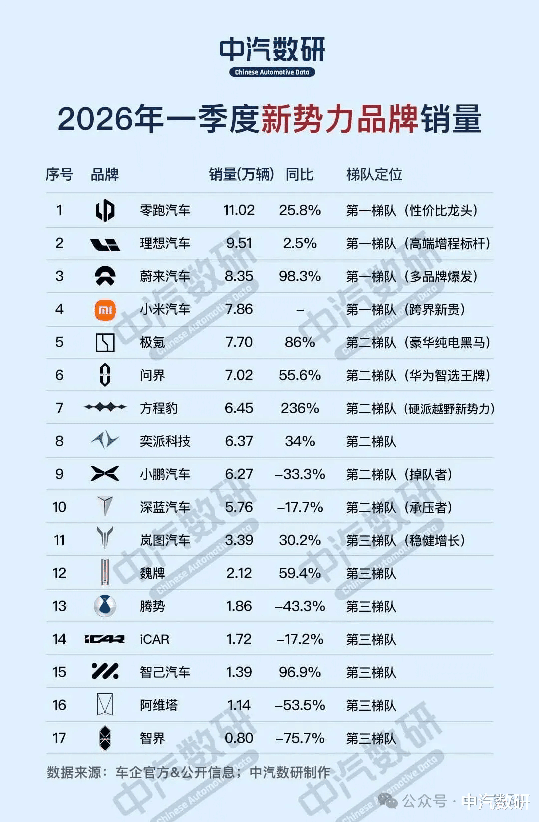 2026年第一季度,国内新势力赛道彻底变天!曾经的“蔚小理”三足鼎立已成历史,第一梯队彻底换血,零跑、理想、蔚来、小米牢牢占据头部;第二梯队分化严重,极氪、问界、方程豹高速增长,小鹏、深蓝大幅下滑;第三梯队生存空间持续被挤压,仅少数品牌实现逆势增长,多数品牌陷入负增长泥潭。
