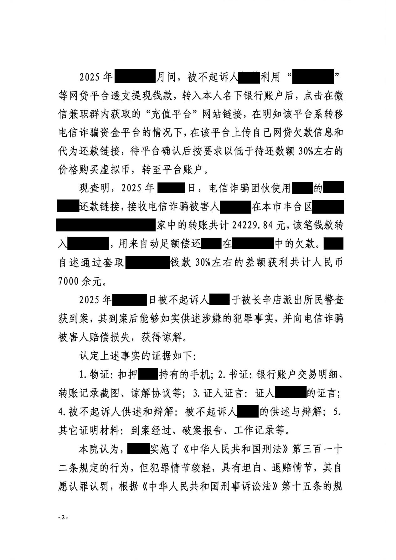 当事人杨某因在网络兼职群中接触“代还网贷”业务,在不知情的情况下被电信诈骗团伙利用,其名下的网贷还款链接成为诈骗资金的接收渠道。公安机关侦查终结后,以涉嫌掩饰、隐瞒犯罪所得罪将案件移送检察机关审查起诉。