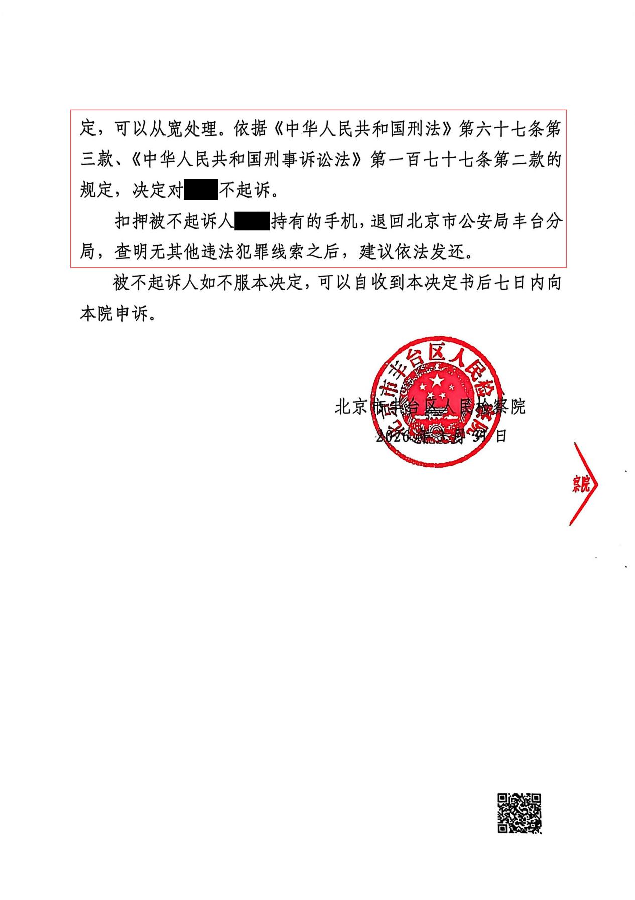 2026年1月,北京市丰台区人民检察院正式作出不起诉决定书。决定书认定:杨某实施了《中华人民共和国刑法》第三百一十二条规定的行为,但犯罪情节较轻,具有坦白、退赔情节,自愿认罪认罚,依据《刑事诉讼法》第一百七十七条第二款的规定,决定对杨某不起诉。