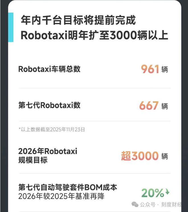 其中,收入端方面,首先是单车辆日均营收:自第七代Robotaxi在广州上线以来,截至11月23日最近两周内,单台车辆日均营收已达299元人民币。这里的营收指扣除折扣和退款后,通过网约车服务产生的总营收。从这299元的日均营收来看,单车辆日均订单量为23单。