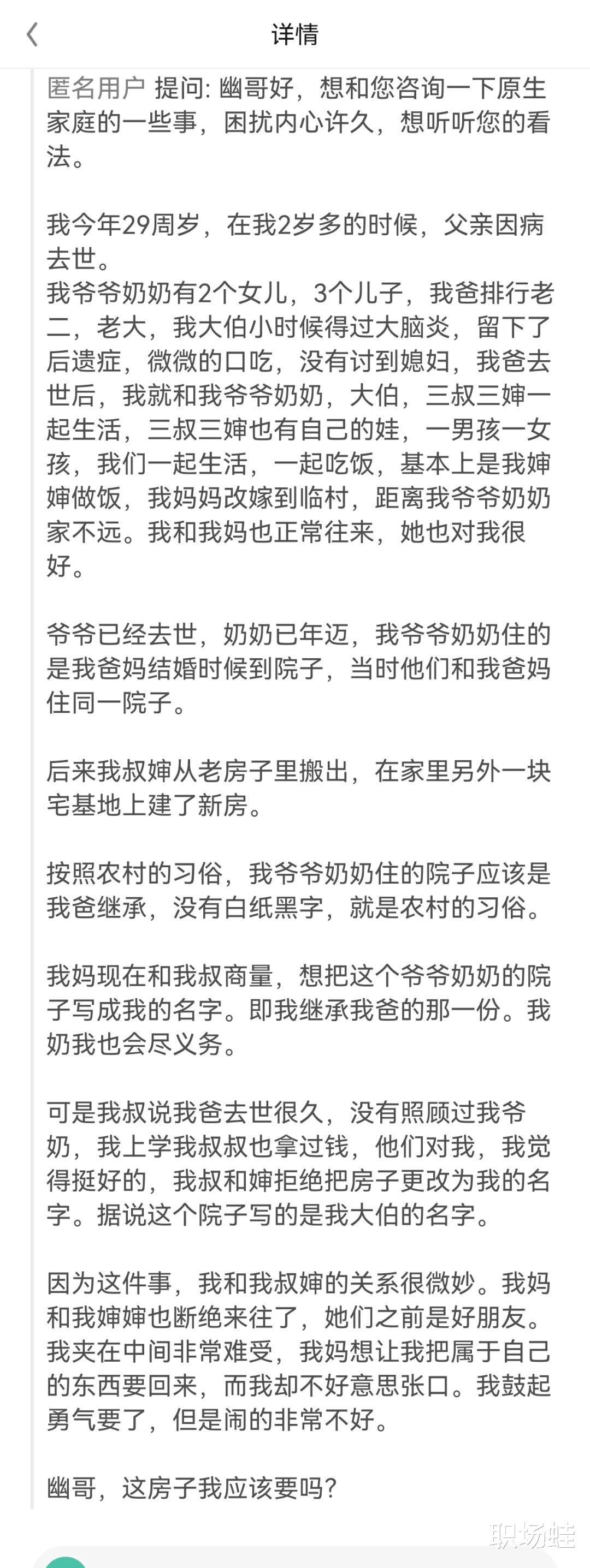“我夹在中间非常难受,我妈想让我把属于自己的东西要回来,而我却不好意思张口。我鼓起勇气要了,但是闹的非常不好。幽哥,这房子我应该要吗?”
