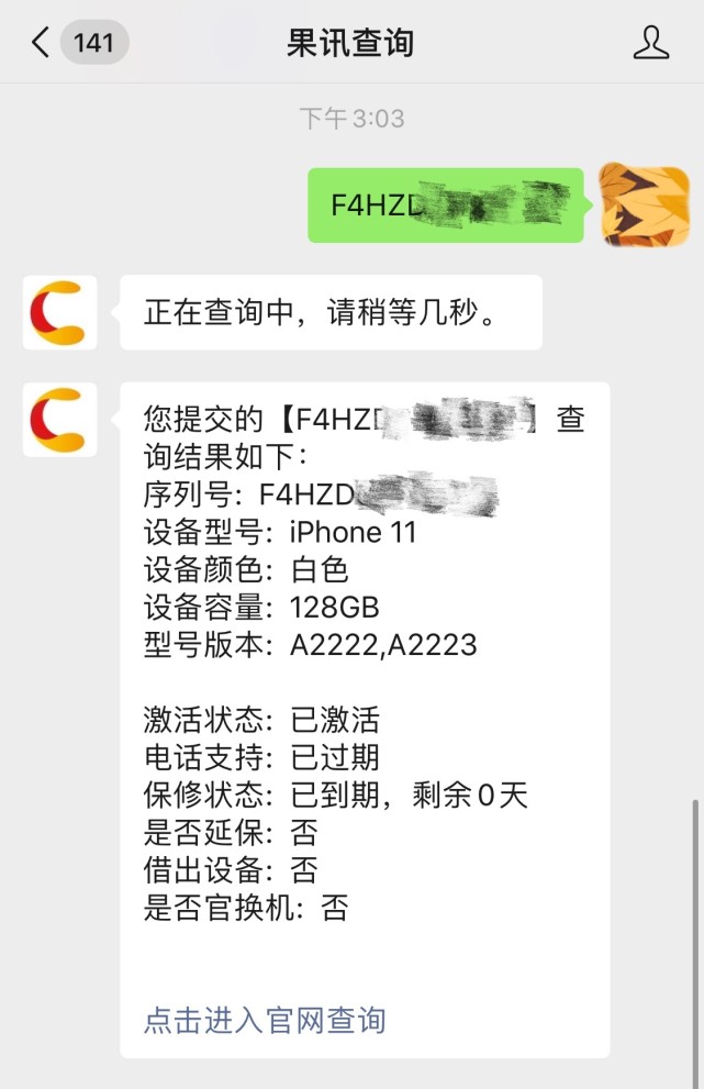 通过查询,果然不出所料,该机器已经不在保修期内了,这就说明了这位网友买到的这台iPhone并不是全新的,而是一台二手机,所以大家在购买iPhone的时候一定要注意了,不懂的要先去网上了解一下注意事项,然后再去入手。