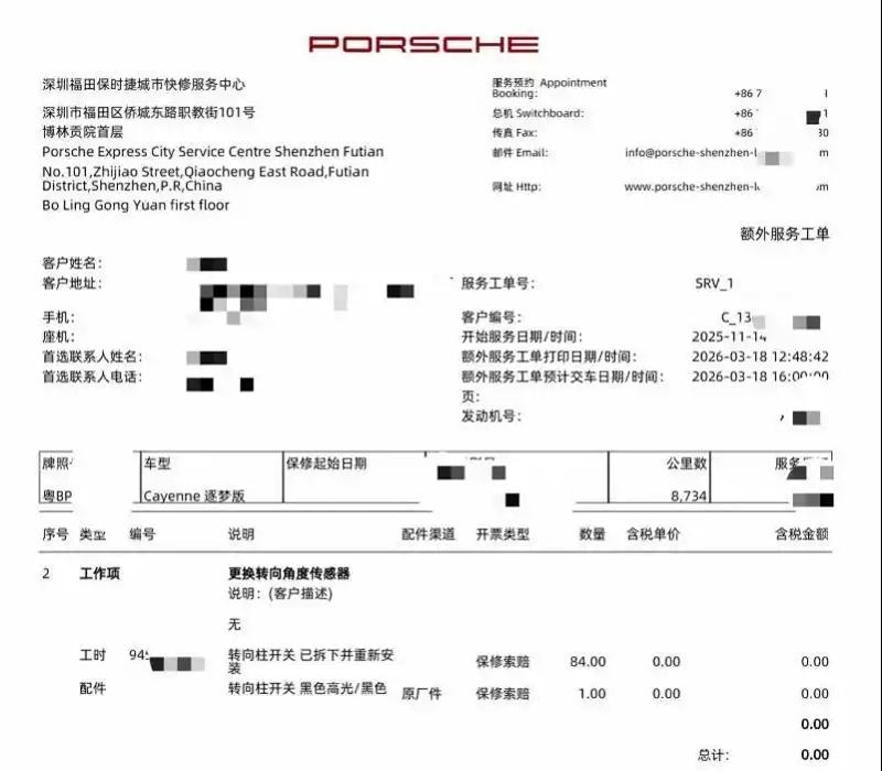 从2025年7月到2026年3月初,车辆累计送修14次,加上最近一次更换方向机,足足修了15次。轮胎对调、四轮定位、方向机重新学习、更换全新方向机、更换方向盘传感器……维修师傅能想到的方案全试了,该换的零件全换、能调的参数全校,保时捷官方也投入技术力量专项排查,可车子依旧跑偏,无法正常上路行驶。